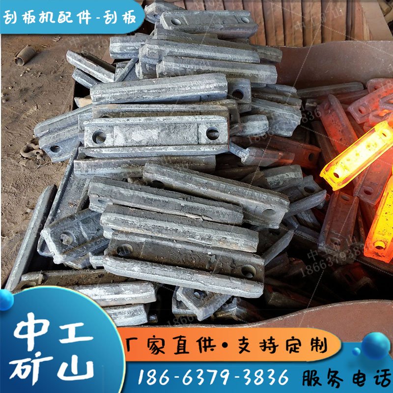刮板是刮板机的配件,刮板在刮板机上起到托起刮板输送机运输介质的作用。刮板在刮板机的中部和链条、联接环一起组成。通过传动部的动力装置在刮板链条的牵引下通过刮板将被输送物传送到目的地点。经过多次淬火模锻成型,刮板的受力程度和抗拉强度高,过煤量大,,刮板可以与链条与压板同寿命。